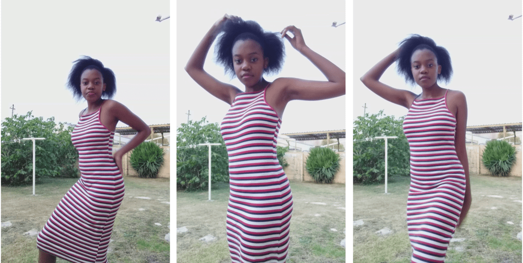 For this outfit, it’s pretty simple yet elegant, a striped dress with sandals (unseen but sure to complete the look). It’s the type of outfit to just relax on your porch/veranda on a sunny day or head to your nearest fast-food joint and enjoy some lemonade with, all just about relaxing. Another thing is that it is tight-fitting to show off your best assets, so if want to feel confident and relaxed, you can pull this off (or on in this case).